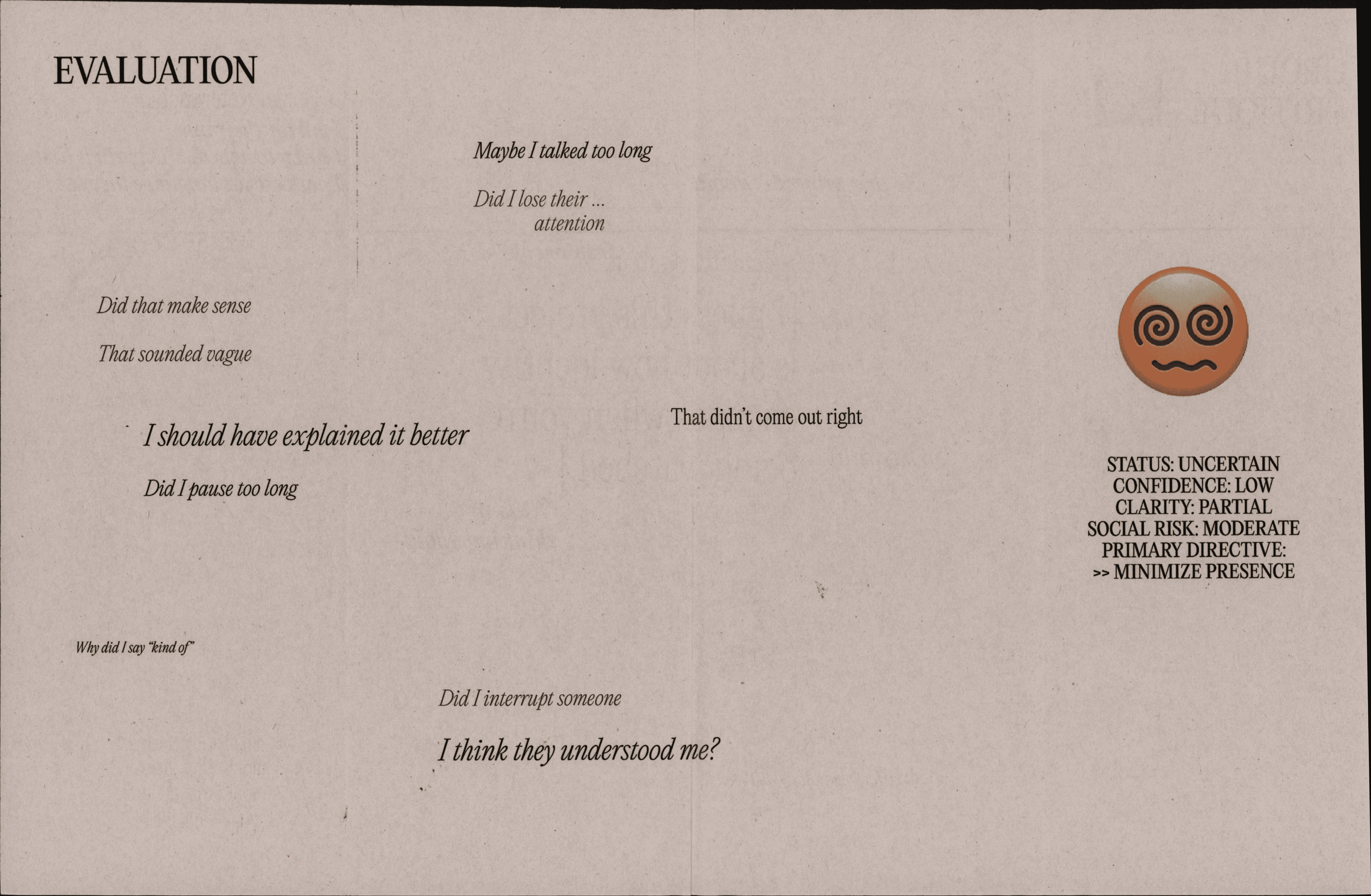 Before I Speak explores the gap between thought and expression, particularly when operating in a second language. It focuses on the delay, hesitation, and internal translation that occur before speech, visualizing this in-between state through typography and layout. Text becomes unstable—shifting, overlapping, and interrupting itself—to reflect processes of correction and self-monitoring. Rather than treating language as fixed, the project presents it as a temporal and negotiable condition, where meaning is gradually formed through thinking, translating, and rephrasing.