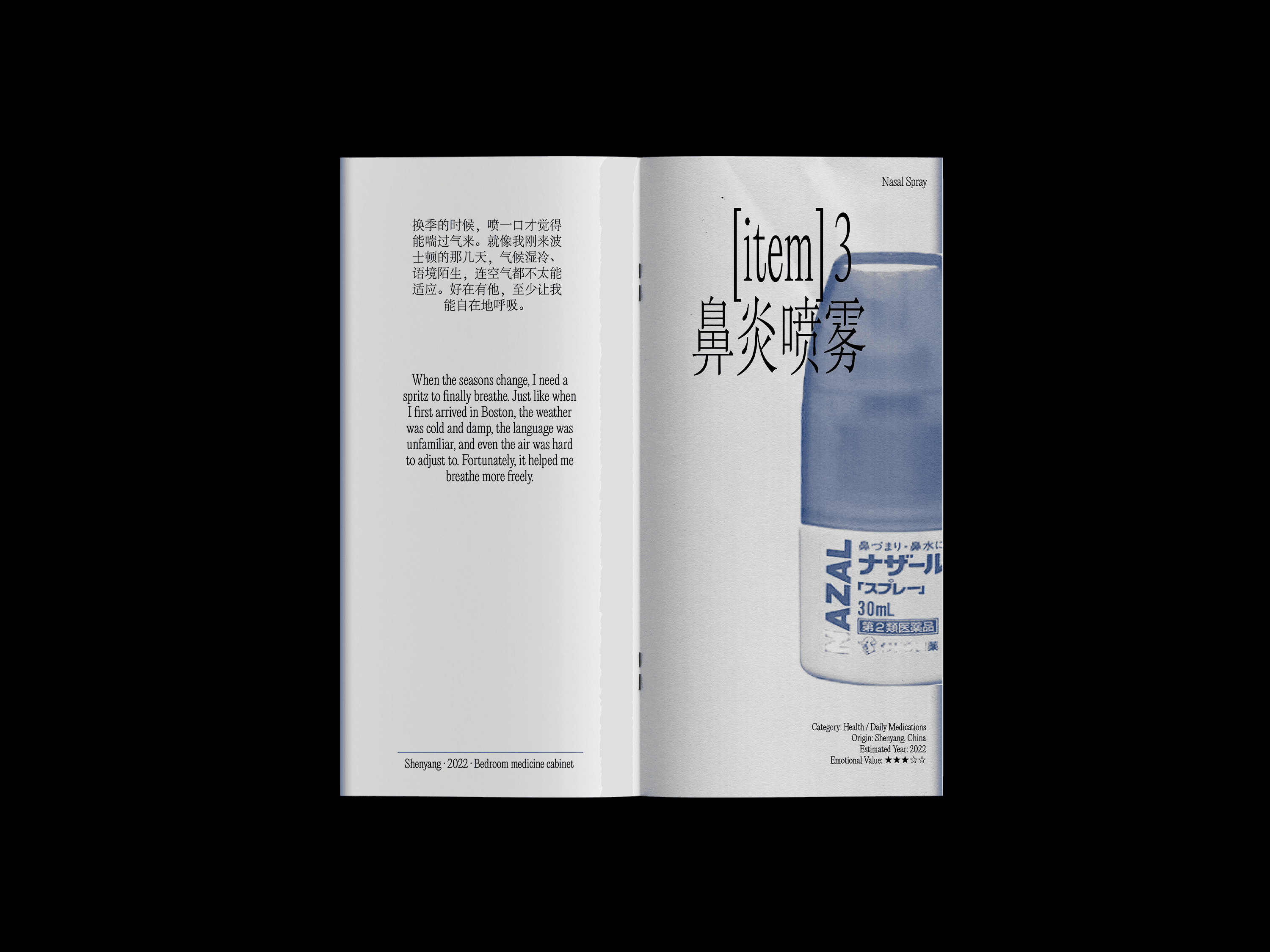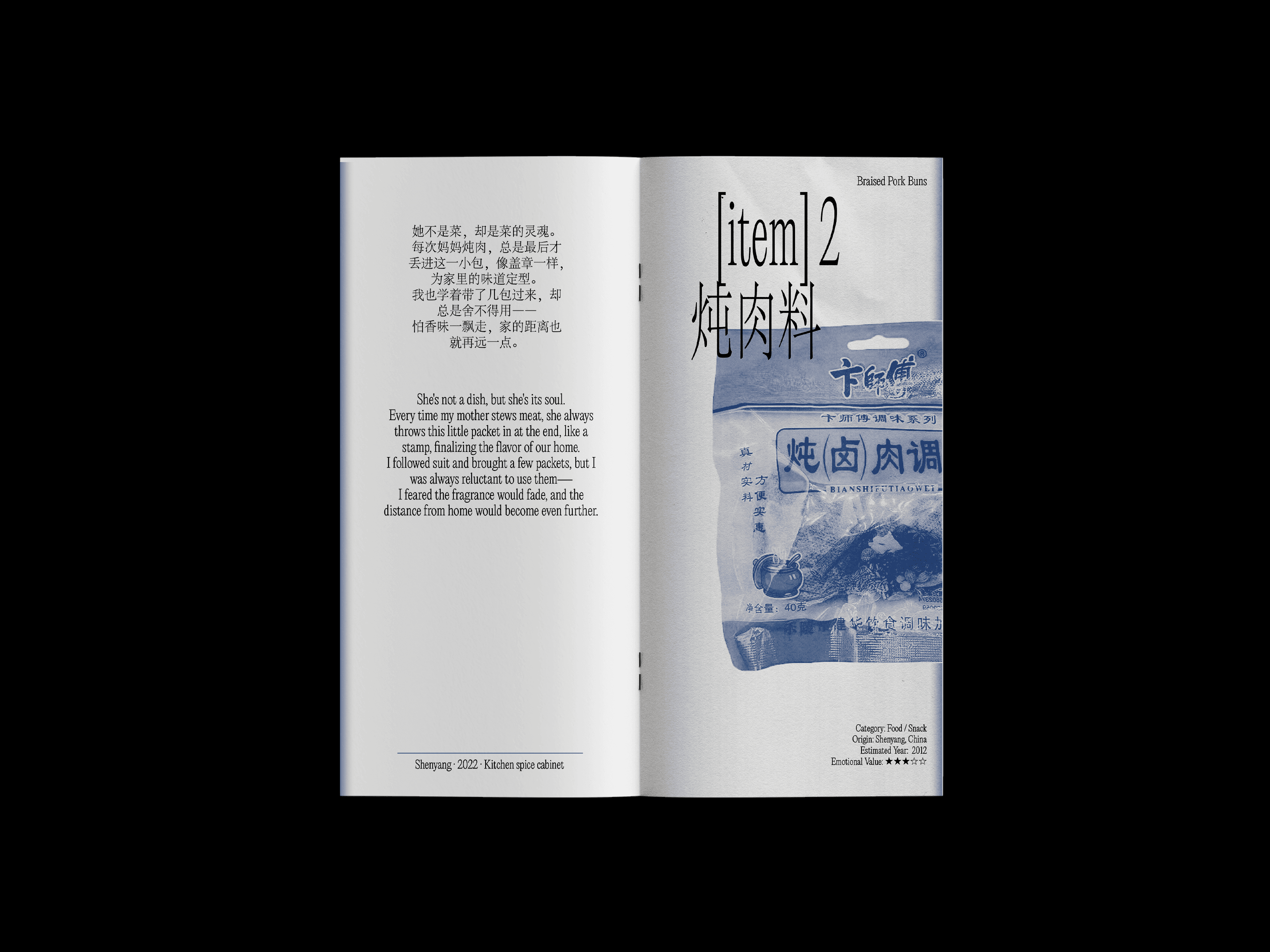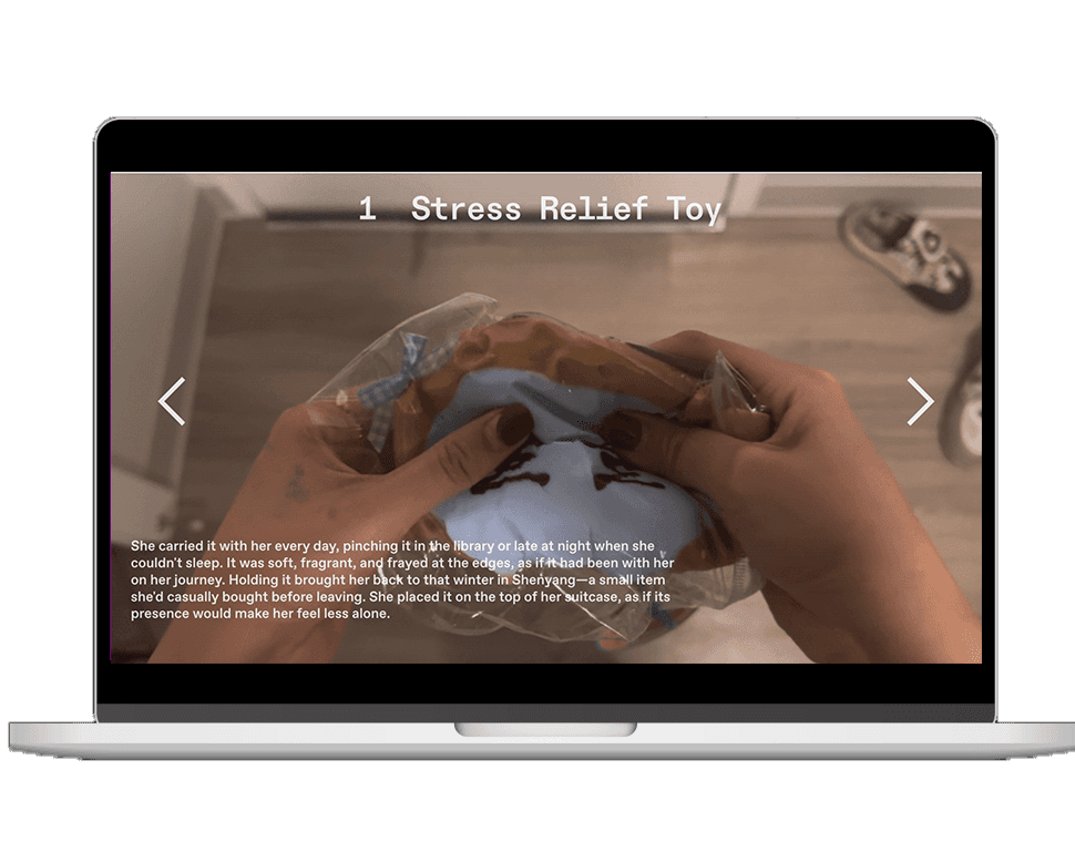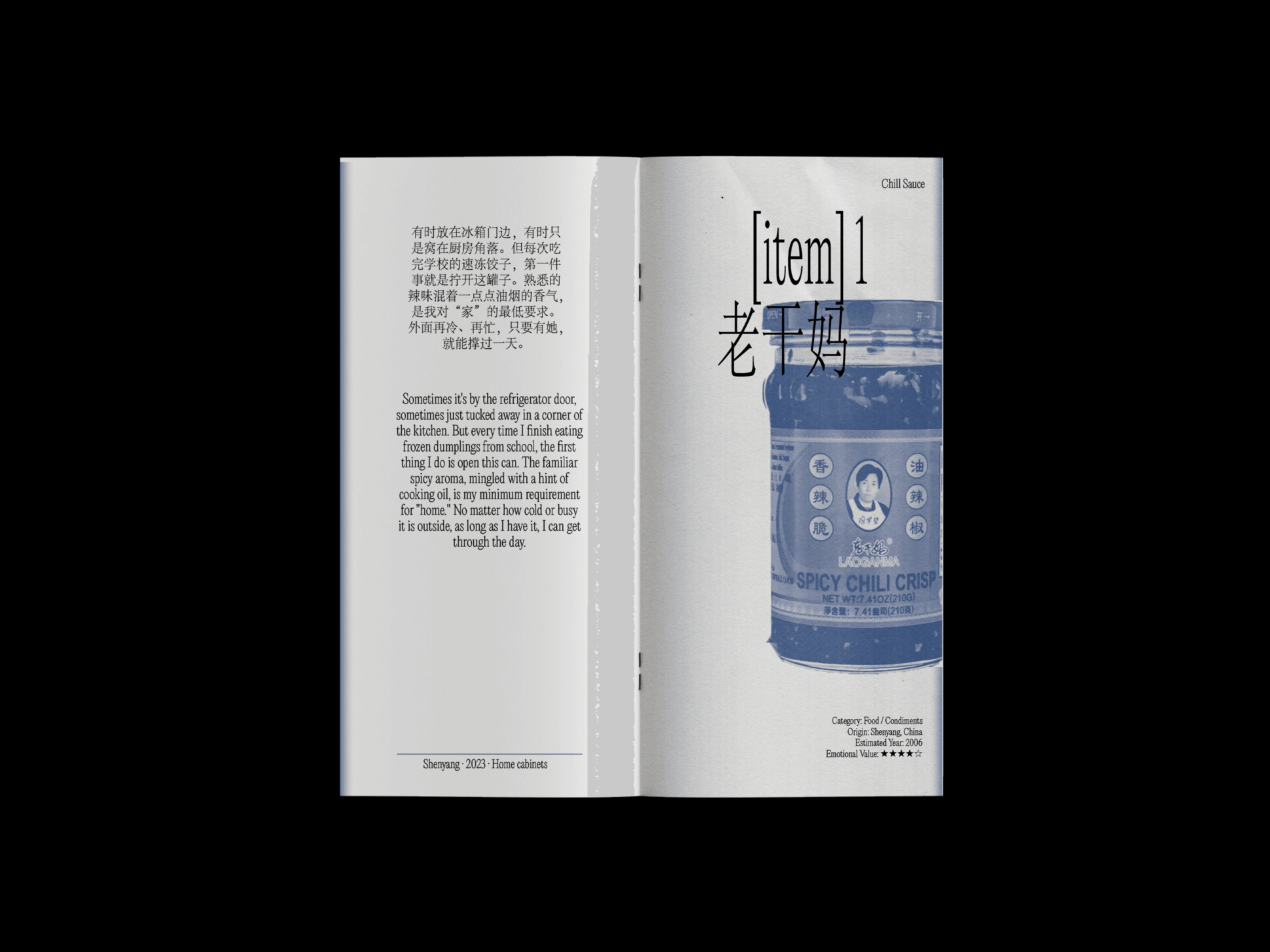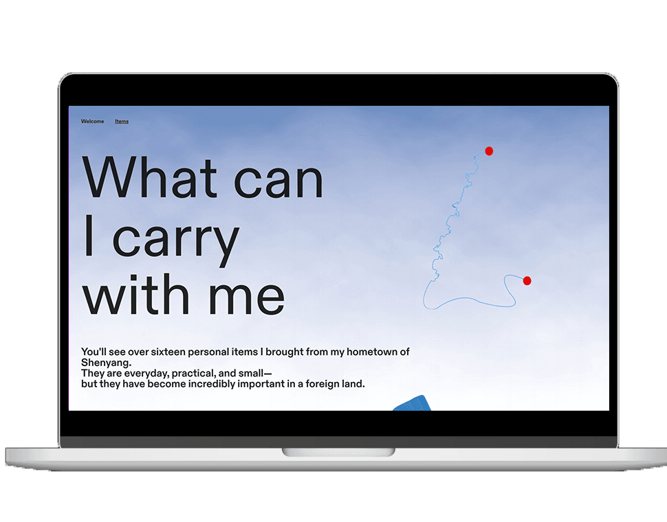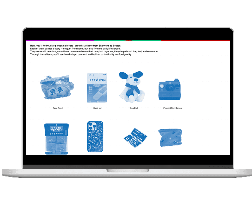 Carry with me is a book and web-based archive that explores how personal objects carry memory, identity, and emotional attachment across cultural transition. Centered on items brought from my hometown Shenyang to Boston, the project documents everyday belongings—food, clothing, and small personal artifacts—as carriers of familiarity and selfhood. Through a combination of printed matter and a digital archive, it reflects on how identity is preserved, translated, and reshaped through what we choose to carry, keep, or leave behind.