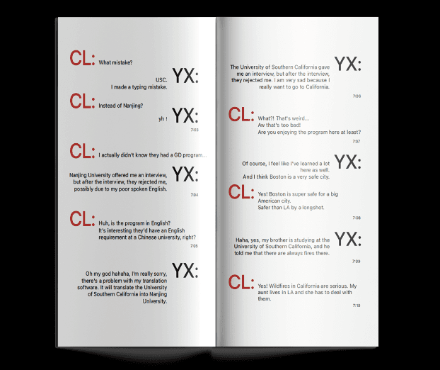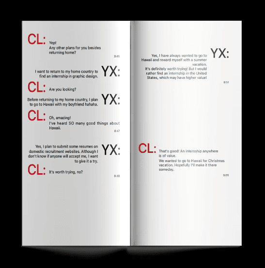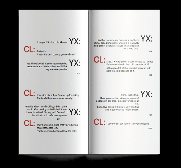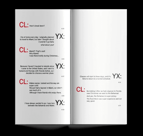 CL:YX explores how conversation can be translated into visual form through rhythm, timing, and interruption. The project focuses on the pace of dialogue—how pauses, overlaps, and delays shape meaning beyond the words themselves. By mapping the speed and gaps of spoken exchange into typography and layout, the work visualizes conversation as a temporal structure rather than a linear text. Words stretch, compress, and shift in relation to silence, reflecting moments of hesitation, anticipation, and response. Instead of treating language as stable content, the project frames it as a dynamic process, where meaning emerges through timing, spacing, and interaction between voices.